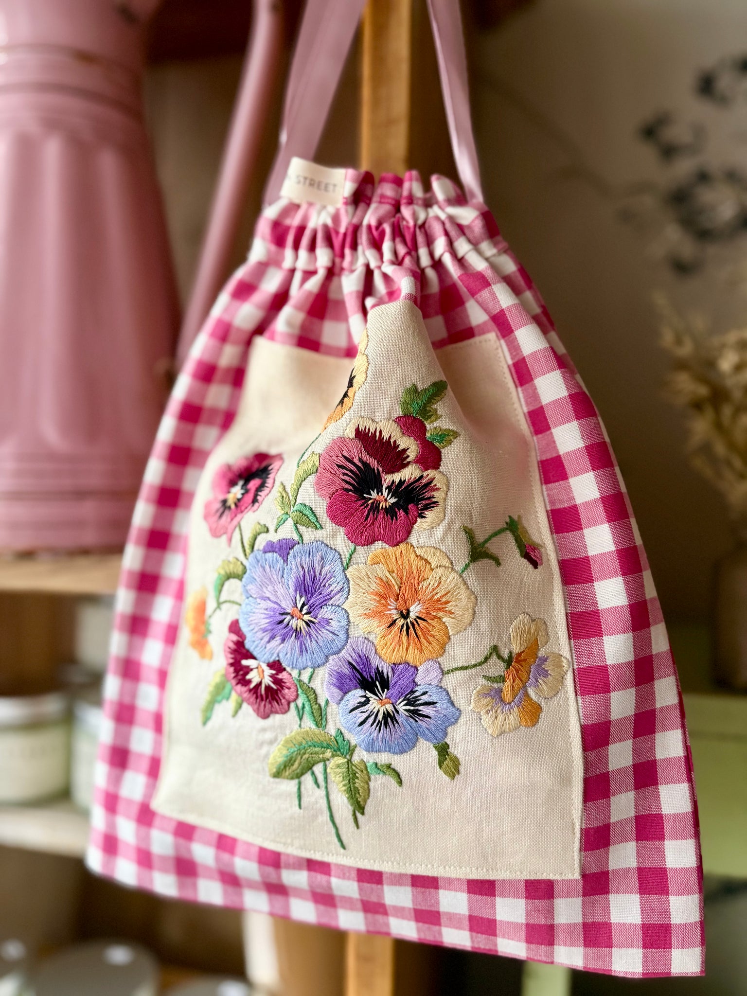 A beautifully handmade little drawstring bag in a lovely pink gingham linen, finished with a hand embroidered panel. Fabric sourced and made in house by Vanessa.