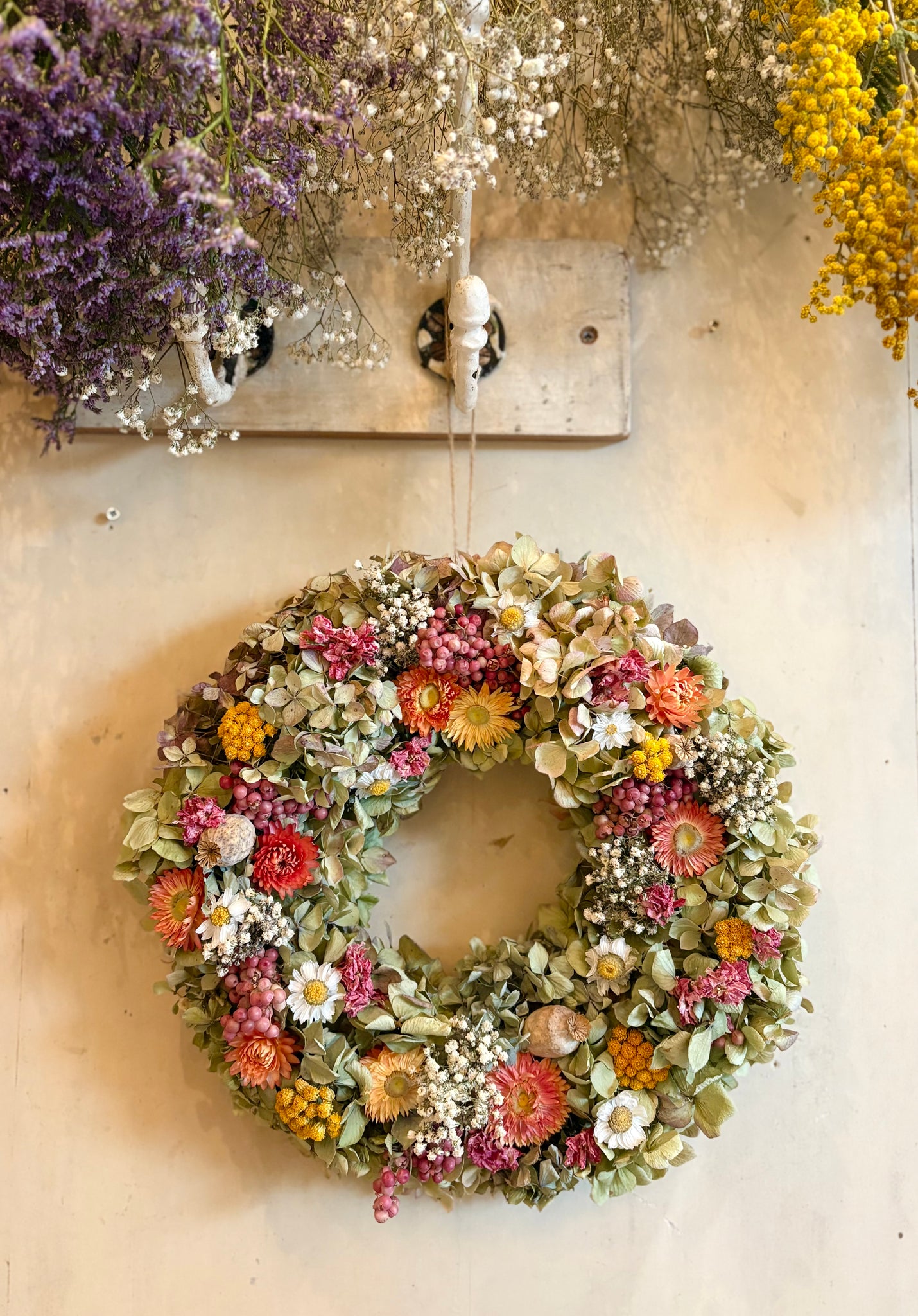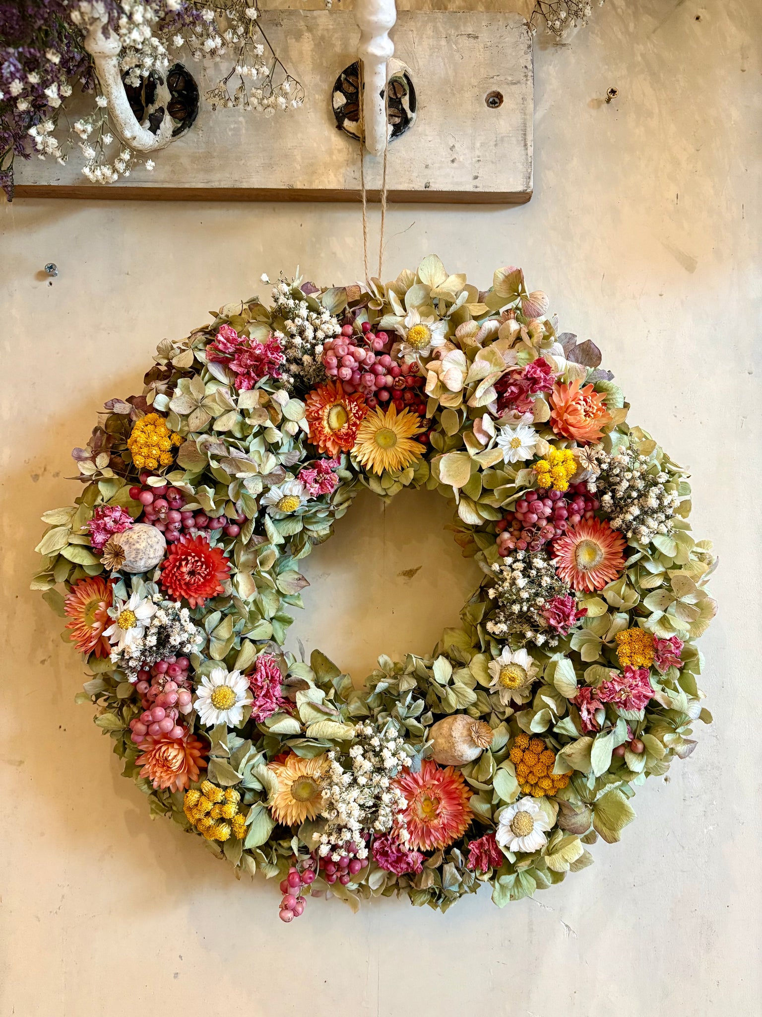 A beautiful dried flower wreath made using a selection of our hand dried flowers. Including hydrangeas, straw flowers, gypsophila, pink pepper berry and poppy heads.