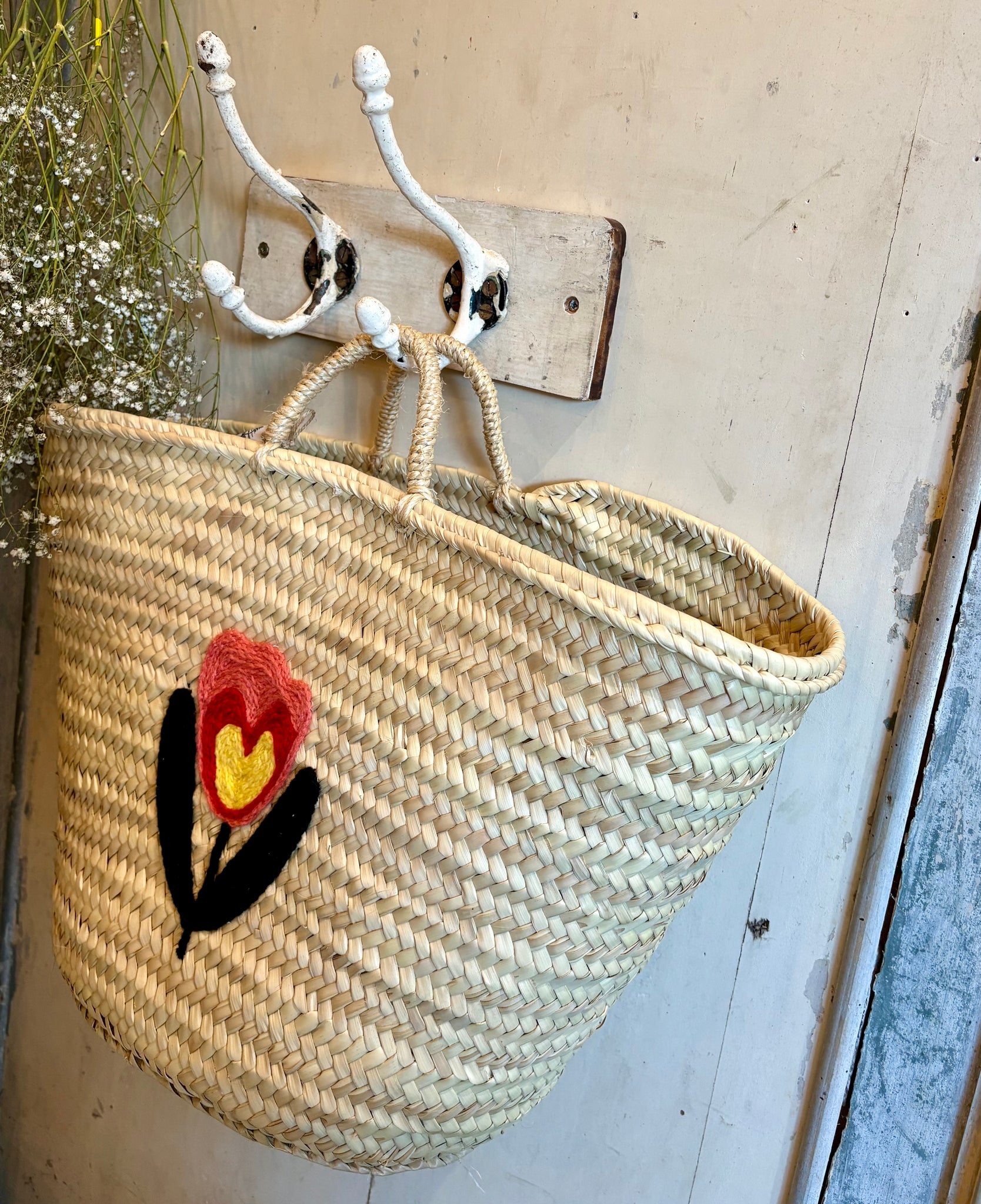 A lovely larger French market basket with straw handles, and an embroidered flower.