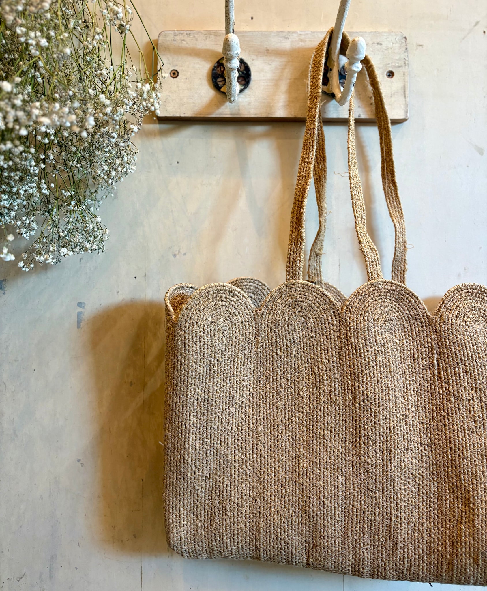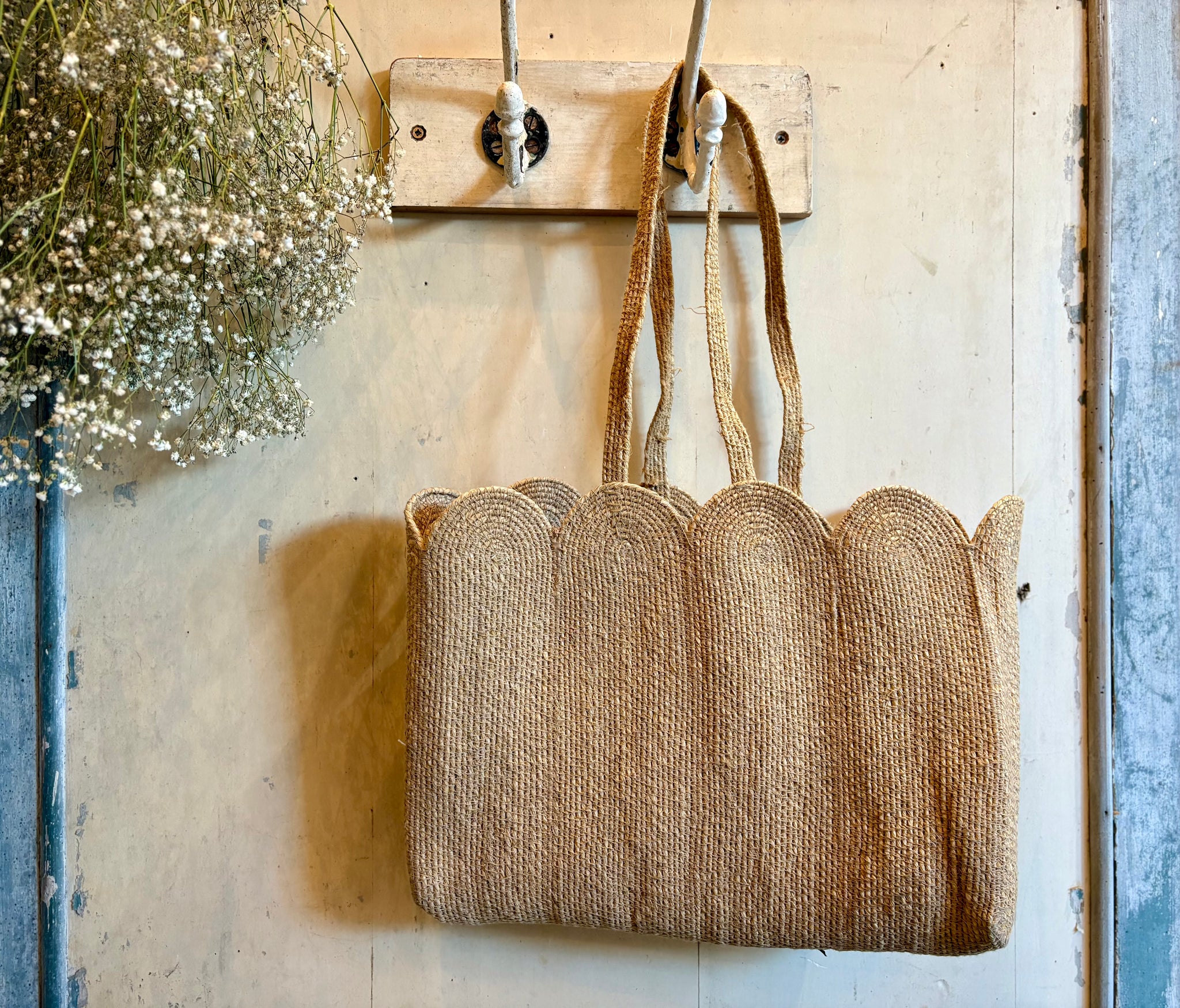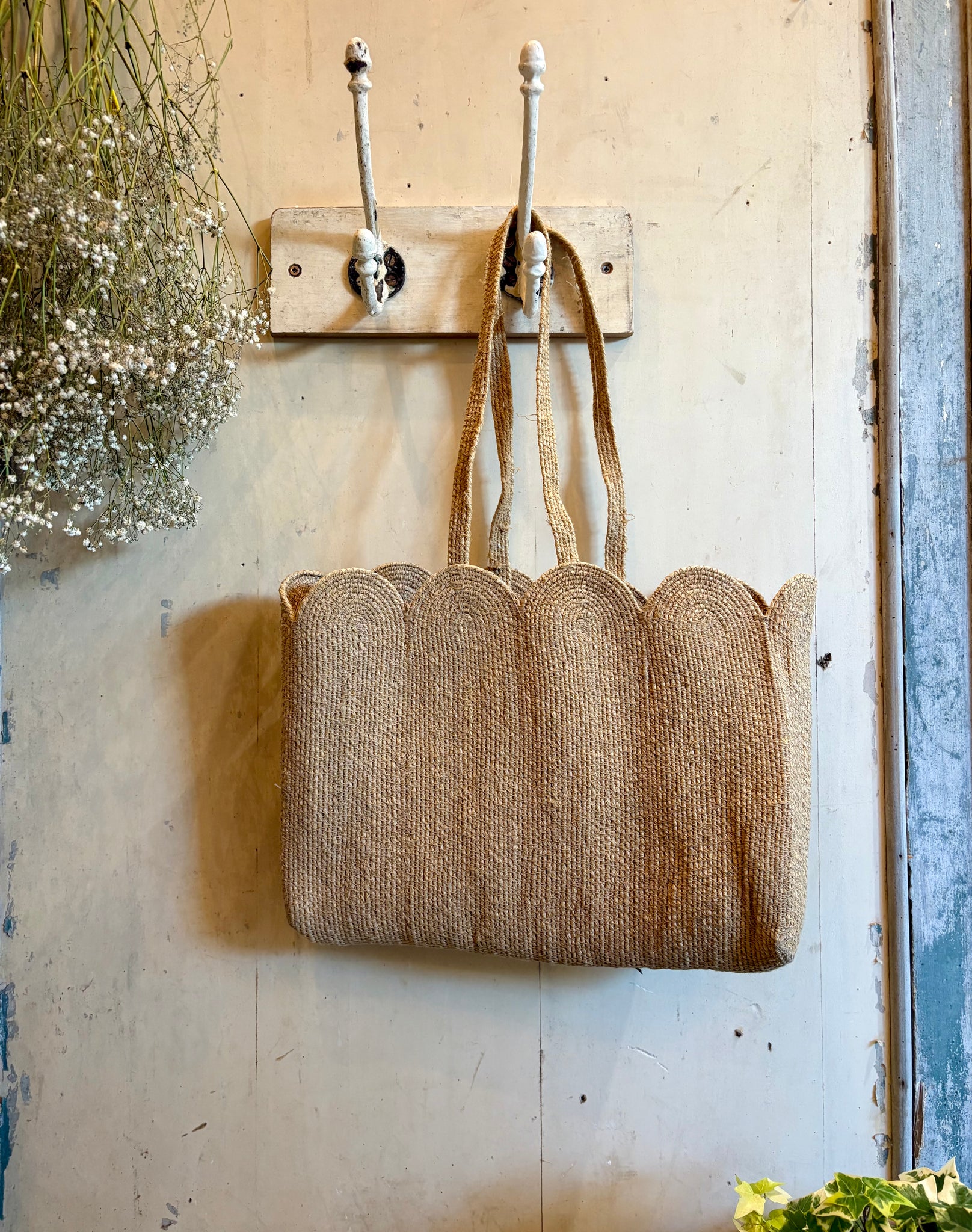 A gorgeous scalloped jute French market bag with jute handles. Would be perfect for summer holidays!