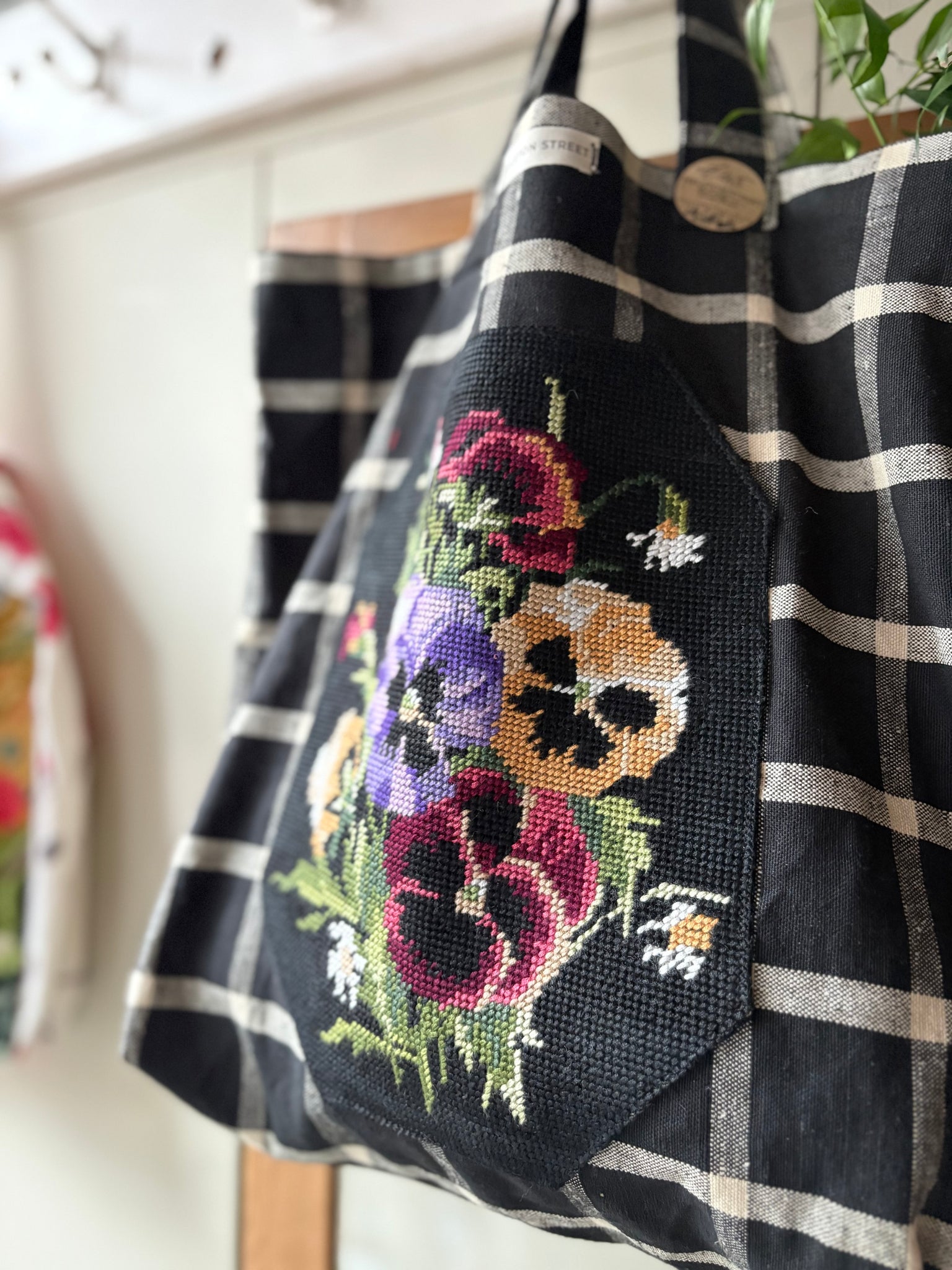 A beautifully handmade tote bag in a lovely heavy linen. Finished with a beautiful vintage hand embroidered panel. These lovely tote bags are quite large, perfect for a trip to the green grocers, or for those lovely beach holidays we are always dreaming of. Fabric sourced and handmade in house by Vanessa.