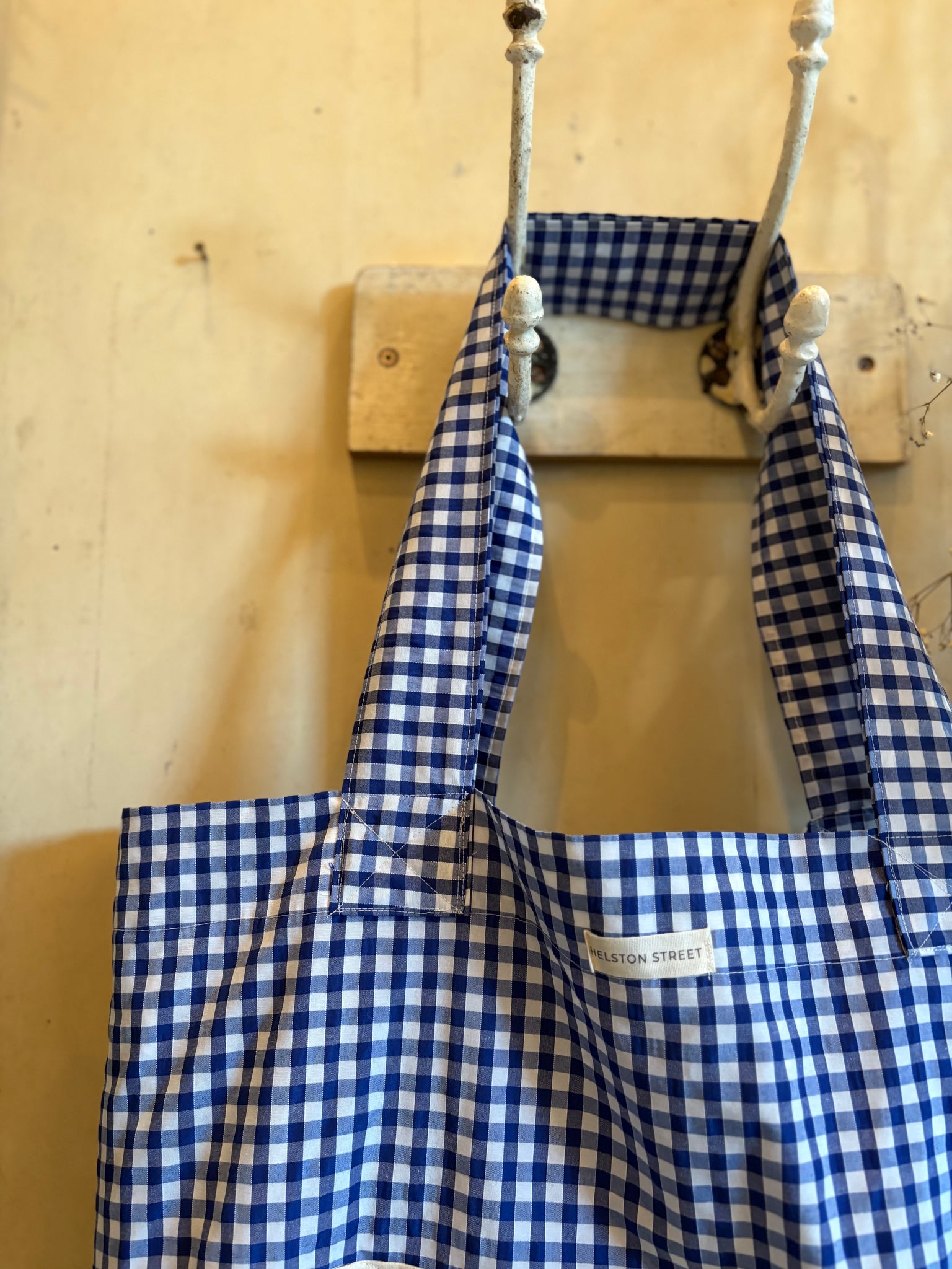 A beautifully handmade tote bag in a lovely blue gingham cotton. Finished with a beautiful vintage hand embroidered panel. These lovely tote bags are quite large, perfect for a trip to the green grocers, or for those lovely beach holidays we are always dreaming of. Fabric sourced and handmade in house by Vanessa.