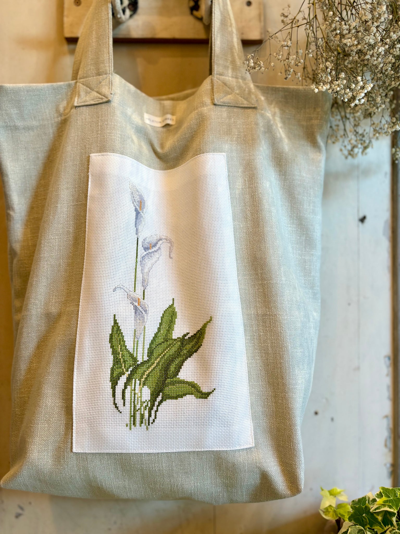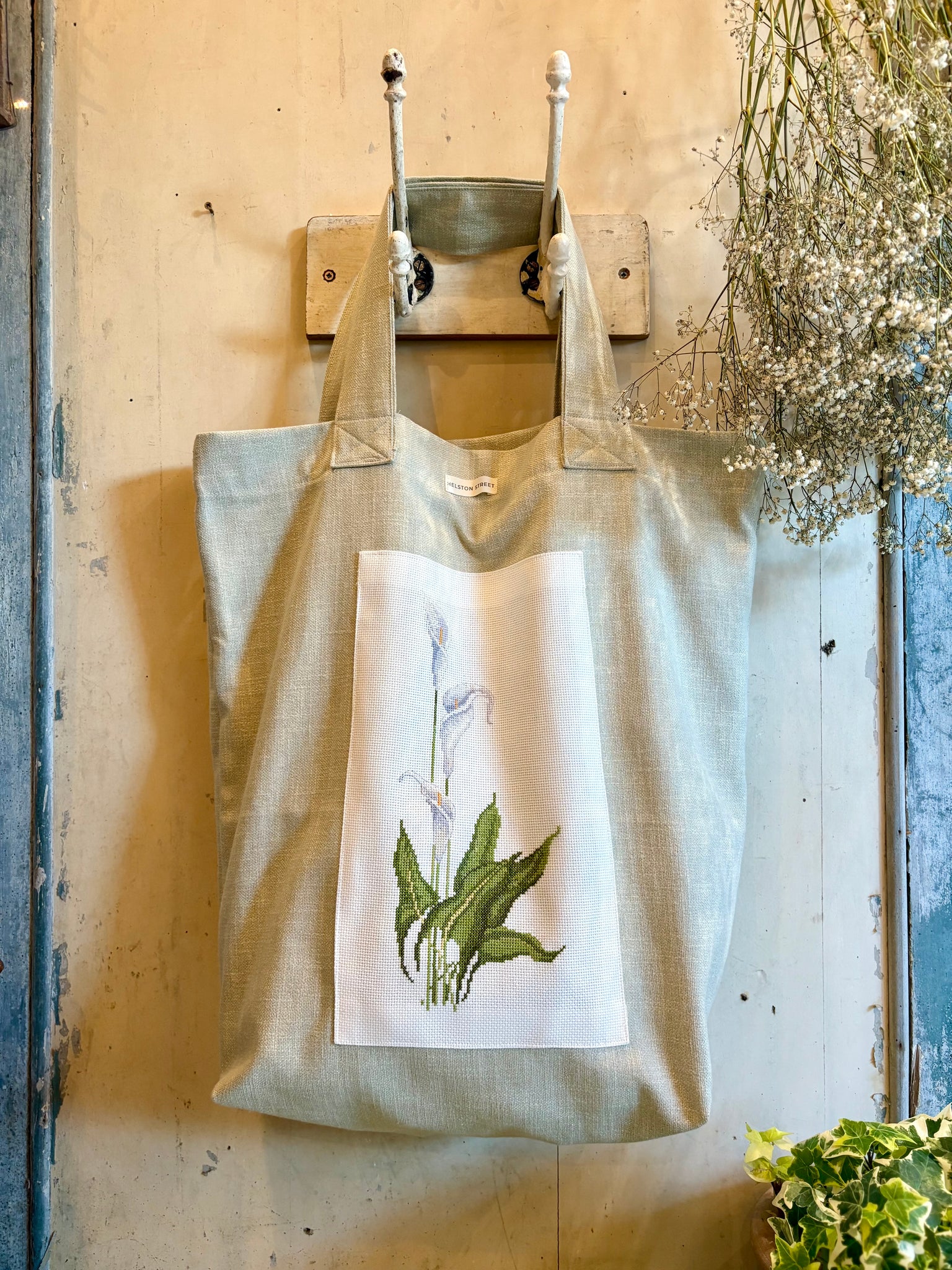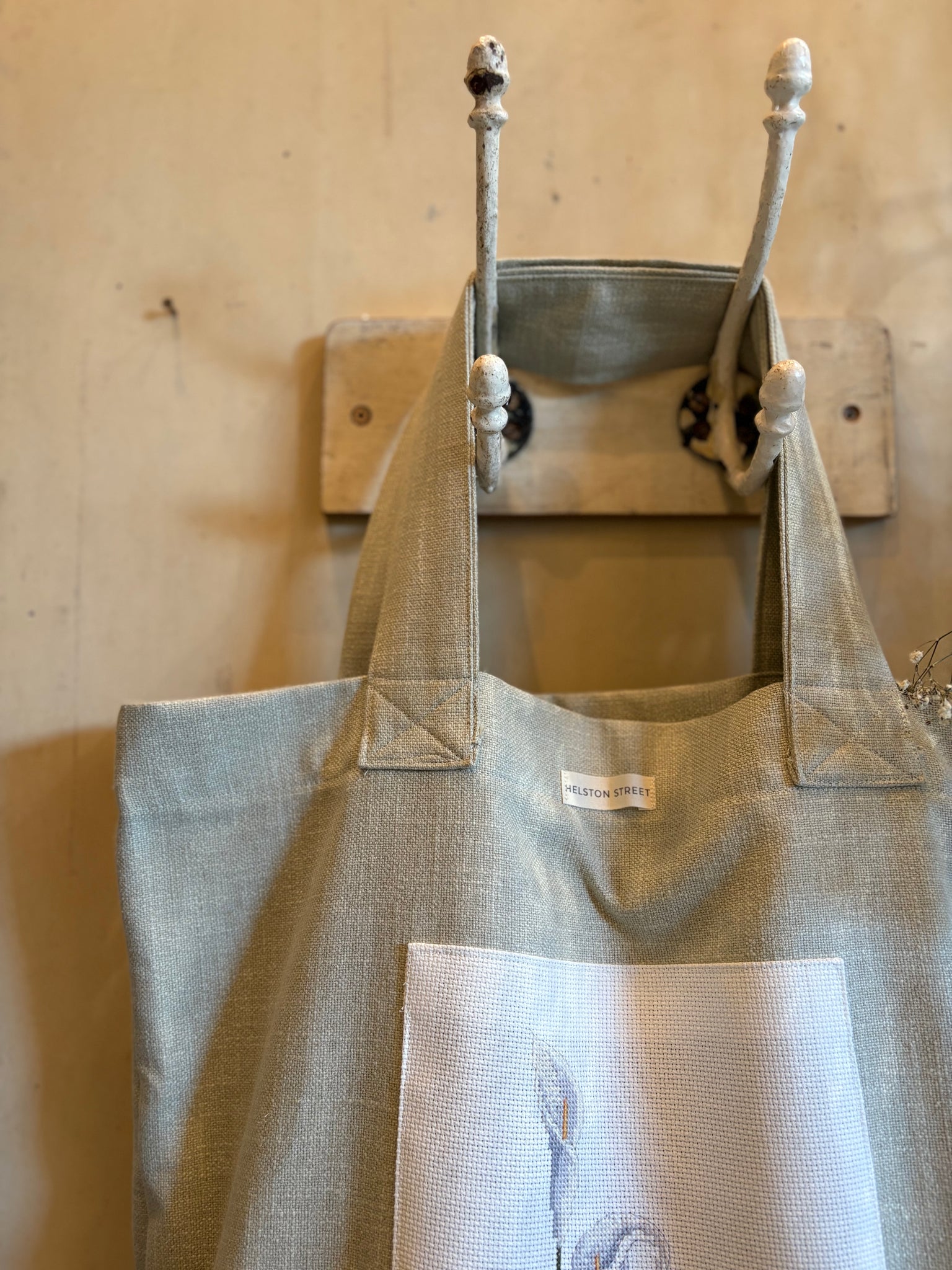 A beautifully handmade tote bag in a lovely blue gingham cotton. Finished with a beautiful vintage hand embroidered panel. These lovely tote bags are quite large, perfect for a trip to the green grocers, or for those lovely beach holidays we are always dreaming of. Fabric sourced and handmade in house by Vanessa.