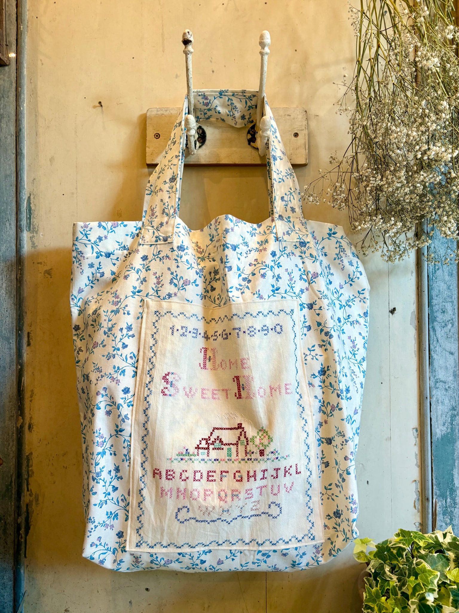 A beautifully handmade tote bag in a lovely vintage blue floral cotton. Finished with a beautiful vintage hand embroidered panel. These lovely tote bags are quite large, perfect for a trip to the green grocers, or for those lovely beach holidays we are always dreaming of. Fabric sourced and handmade in house by Vanessa.