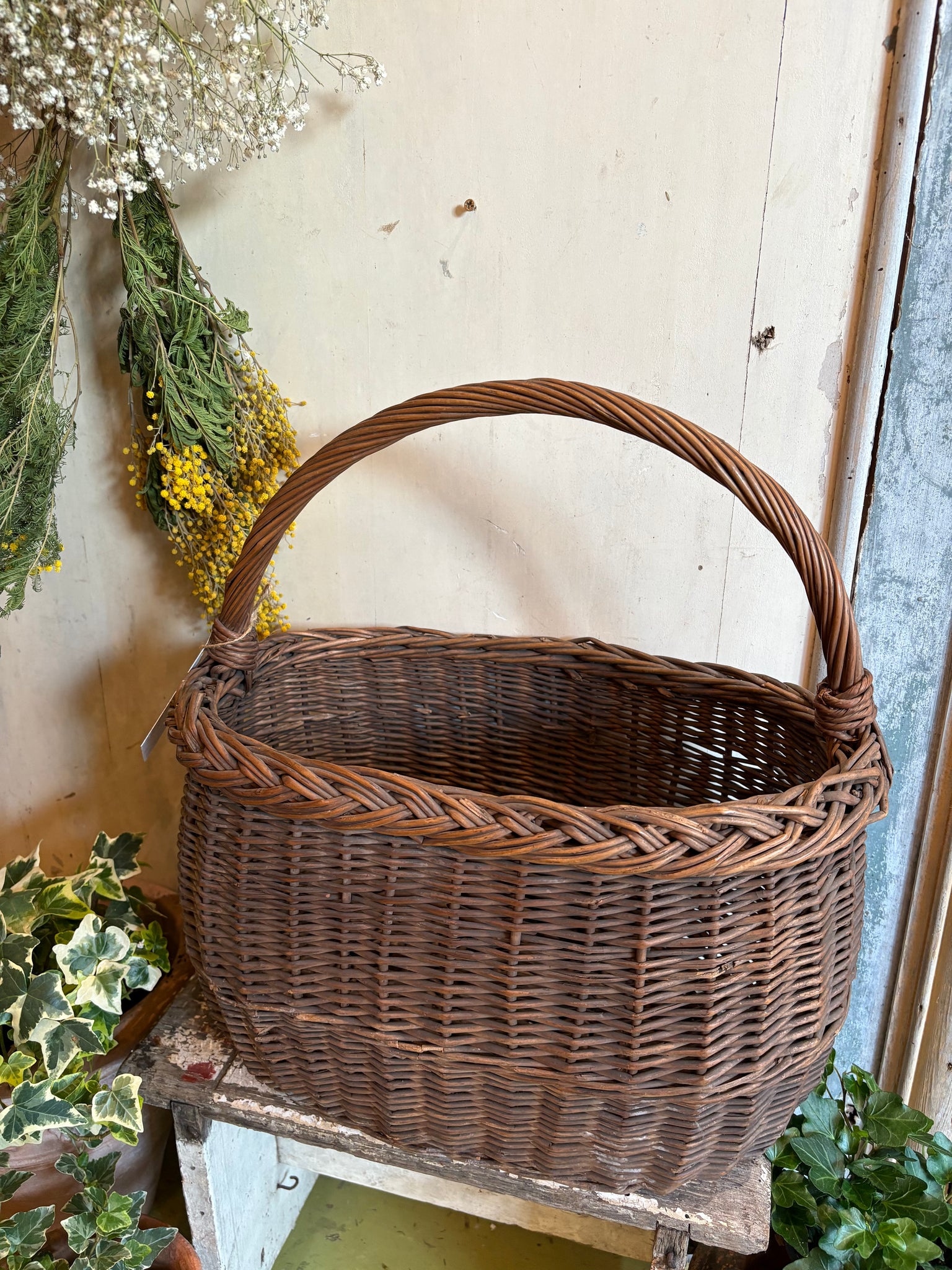 A lovely small oval wicker basket with handle.