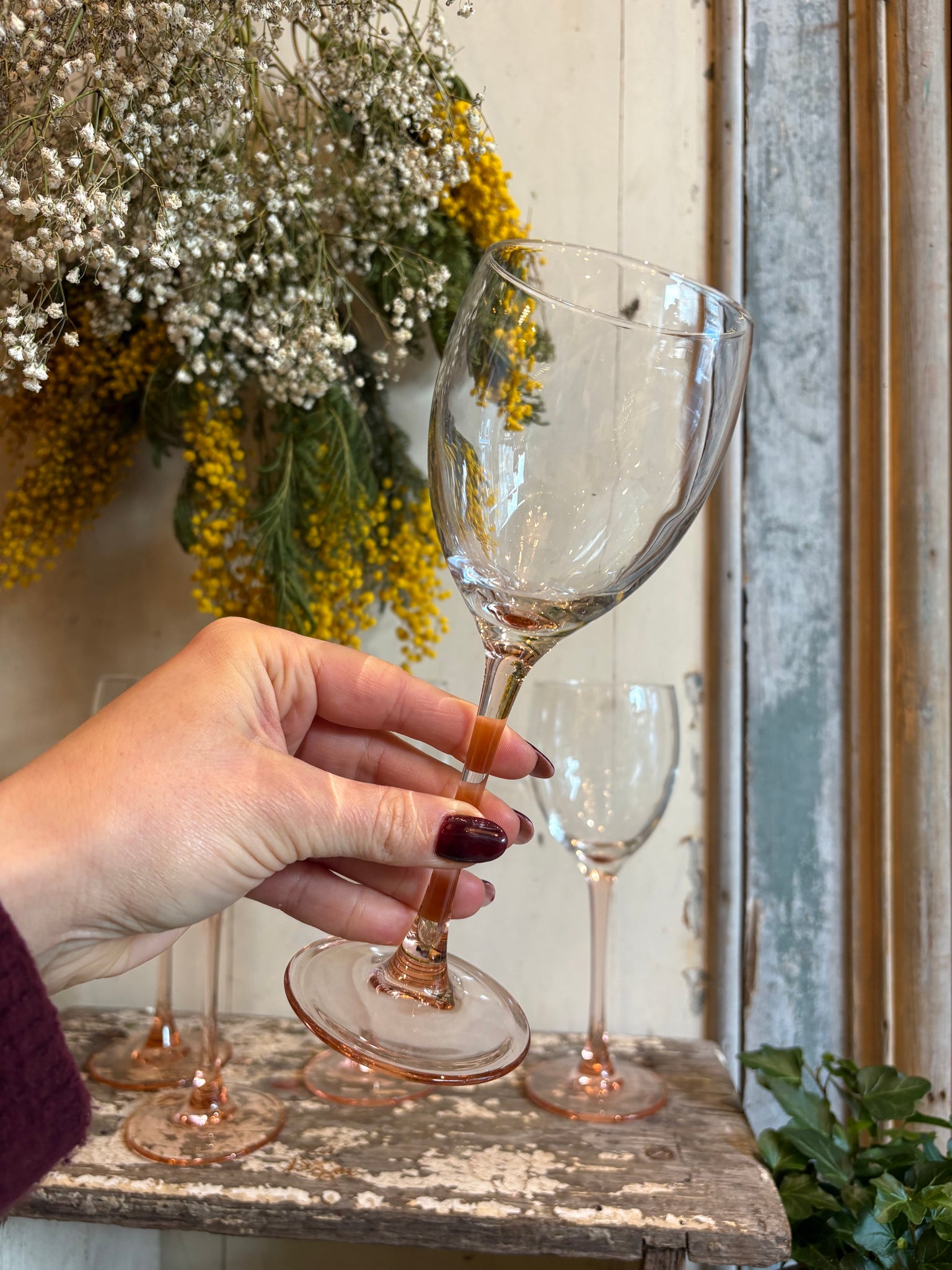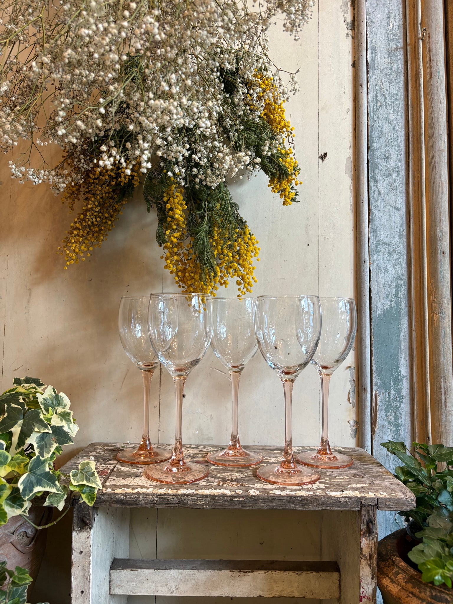 A set of 5 beautiful vintage French wine glasses. Each with a lovely pink stem.